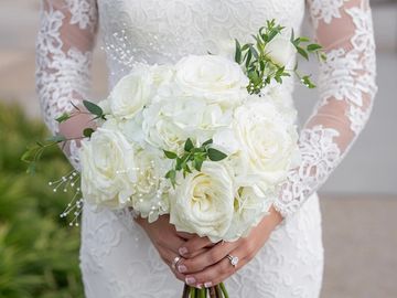 Classic white wedding bouquet, timeless and elegant, embodies the purity and grace of a wedding day. At Petals & Flames, we craft these stunning bouquets using the finest white blooms. Our skilled florists incorporate lush greenery and subtle accents to enhance the bouquet's natural charm, creating a harmonious balance that feels both fresh and sophisticated.